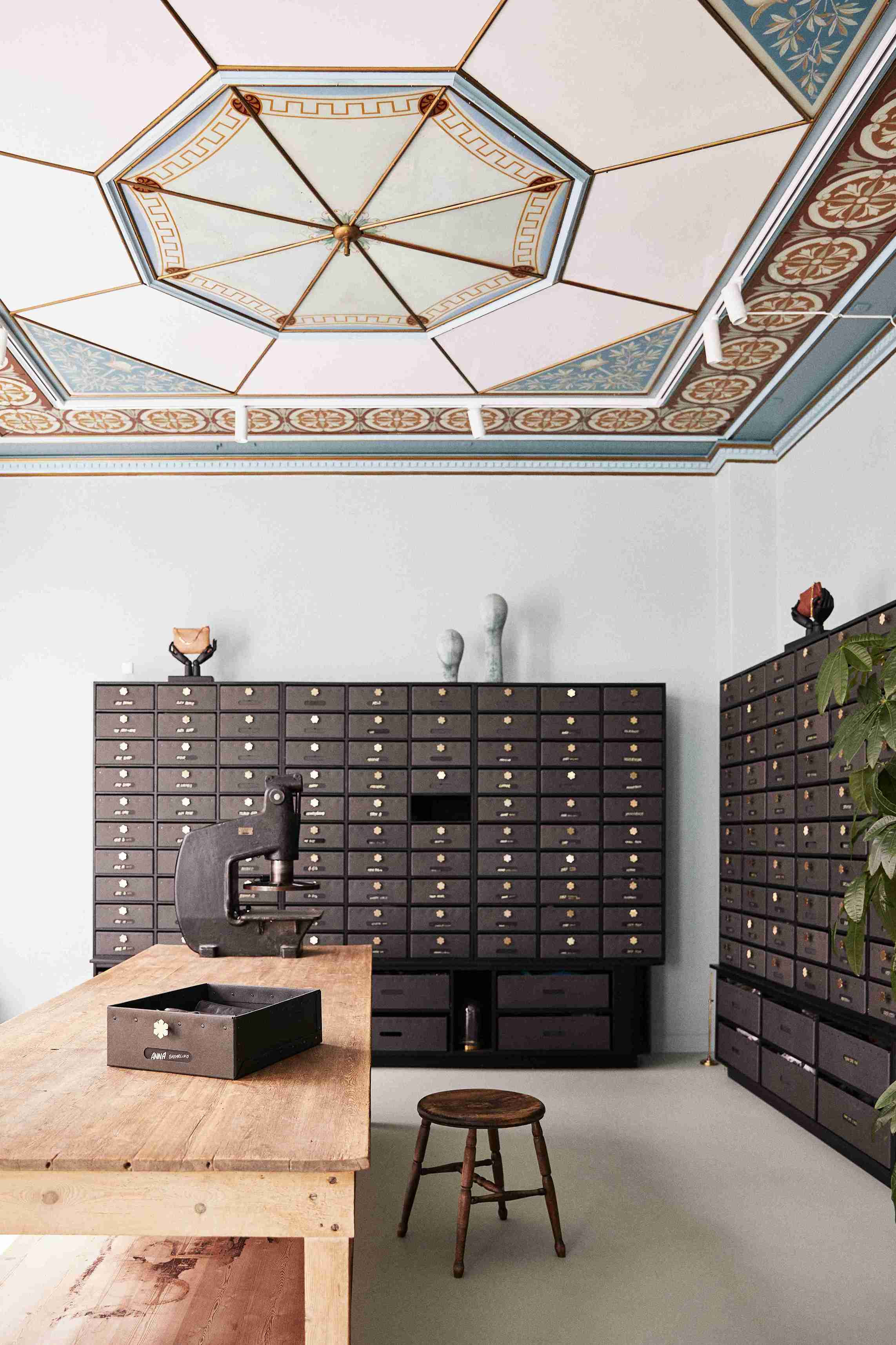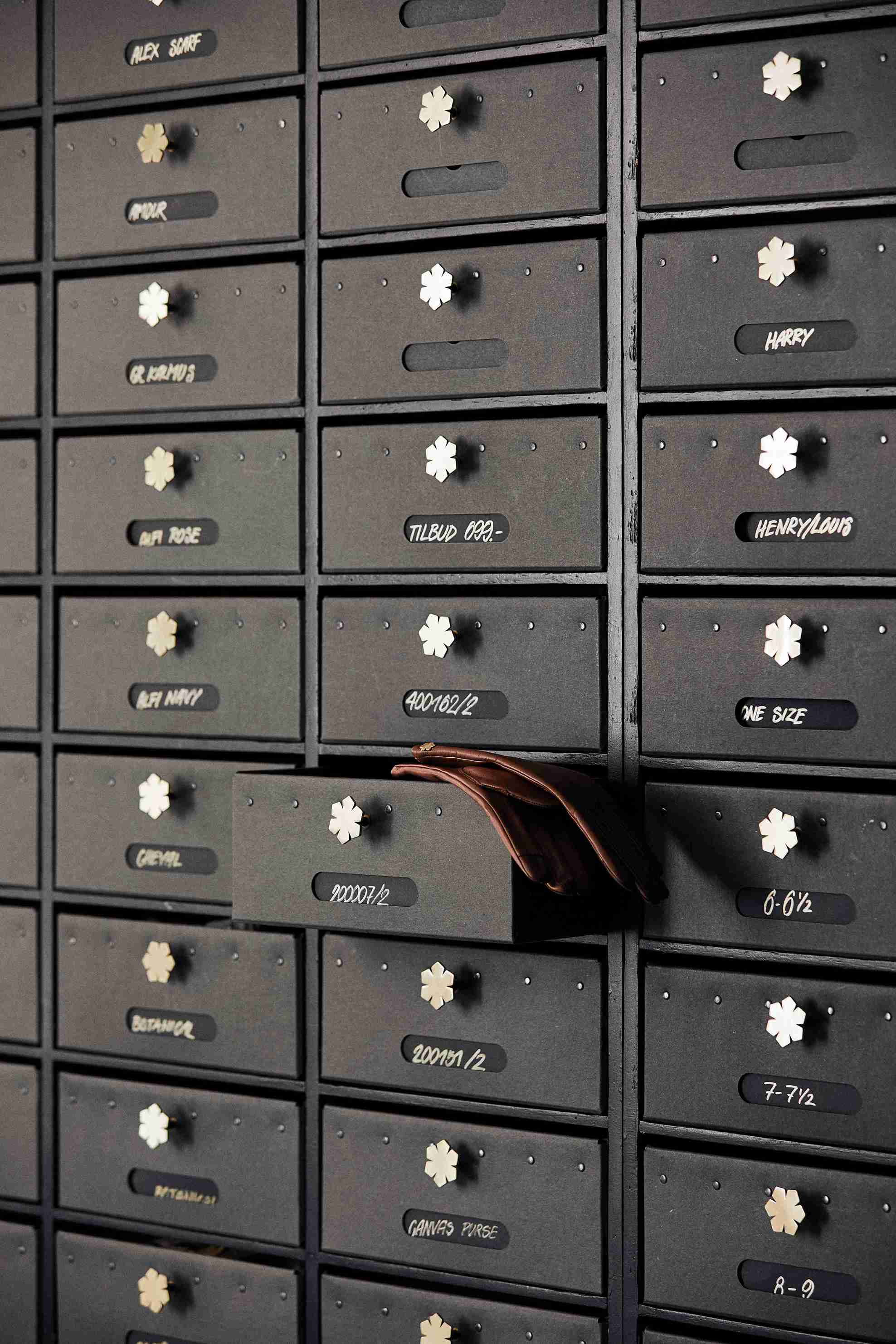 Det smukke håndtag på æskerne er Kalmus-blomsten, der er Rhanders' logo. Blomsten går igen i butikkens indretning, og ser du efter på handskerne, er hver eneste prydet med en lille forgyldt Kalmus. Du kan besøge Rhanders og læse mere om Kalmus-blomstens betydning lige her.