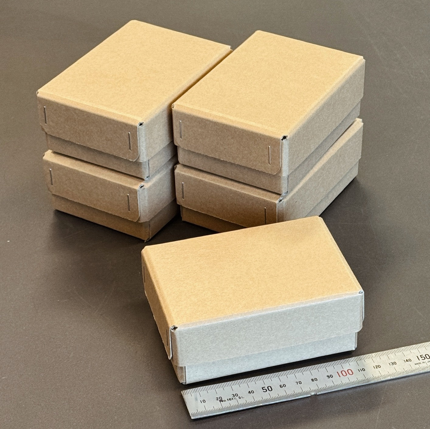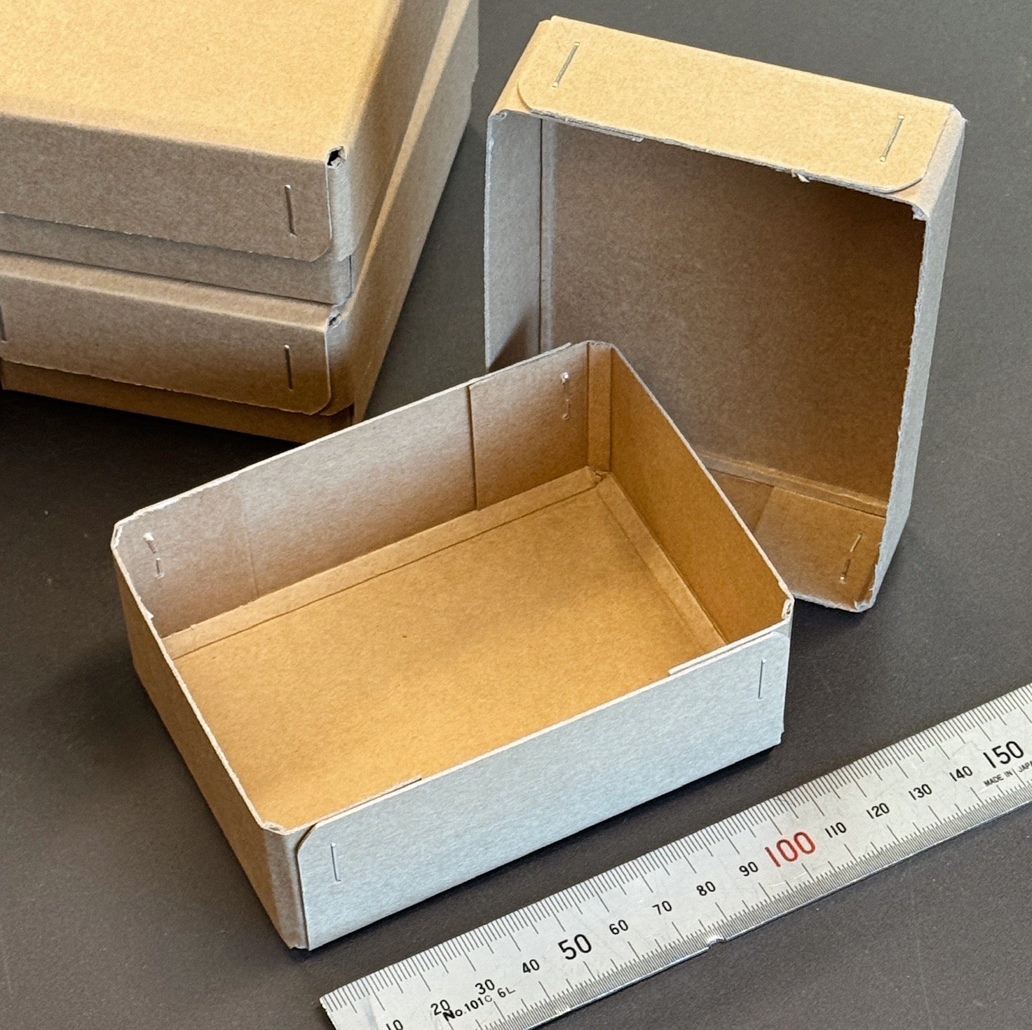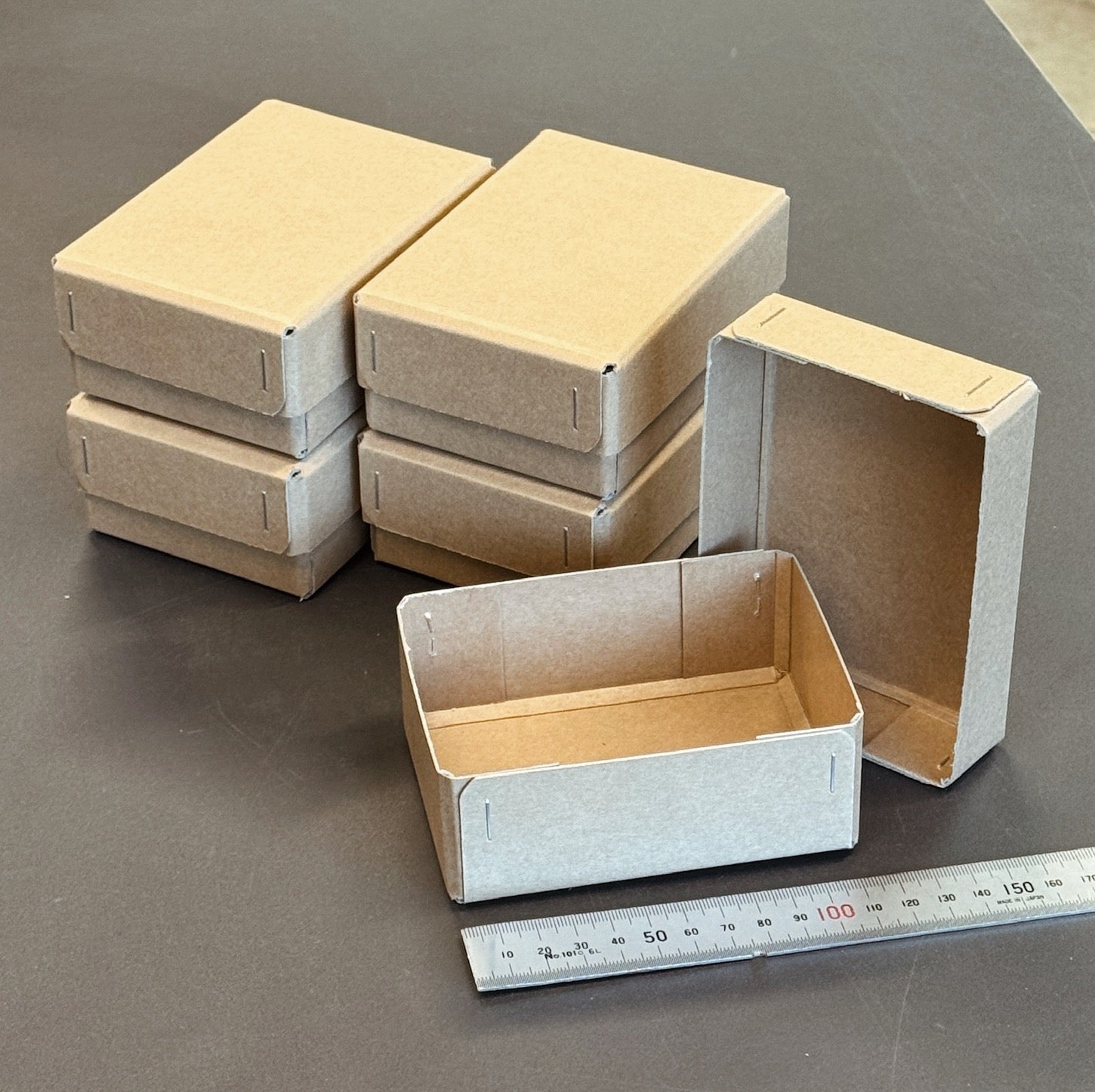 Fem små æsker af tynd karton. Æskerne er samlet med klammer.